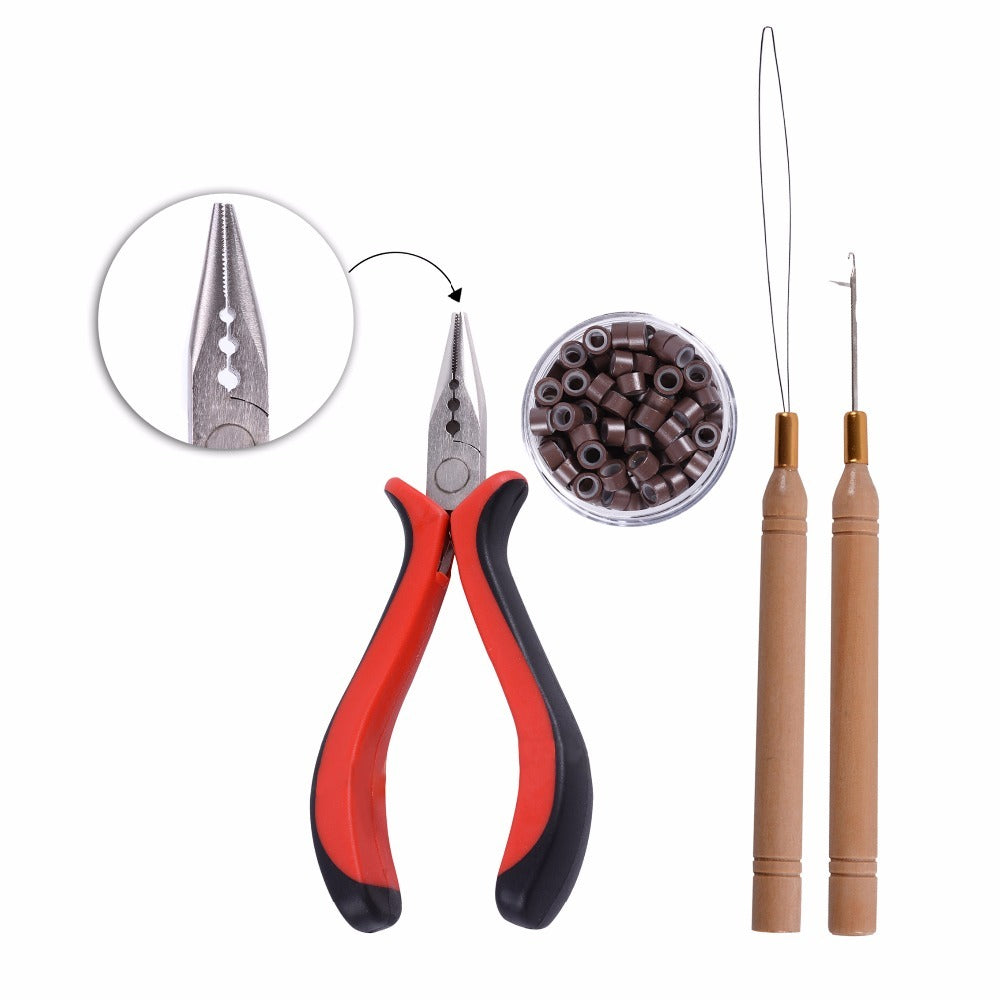 100 hair extensions + 1 short crochet hook + 1 long crochet hook + 1 3-hole pliers